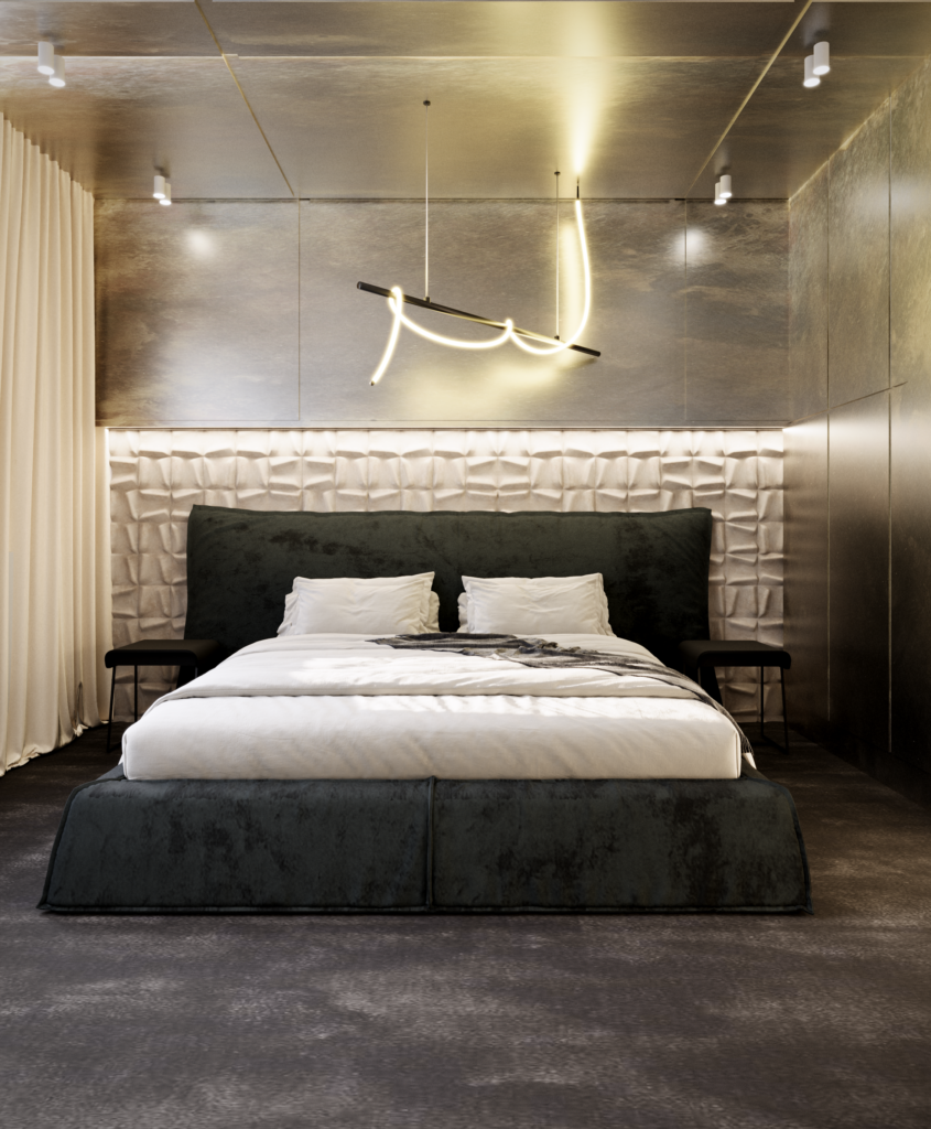 The primary bedroom is designed like a luxurious hideaway, featuring a bed area highlighted by custom ceramic tiling that seamlessly integrates with bespoke silvered wall paneling, extending boldly to the ceiling and the front of the wardrobe.