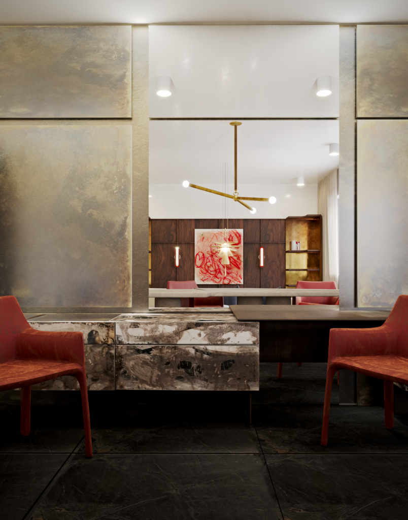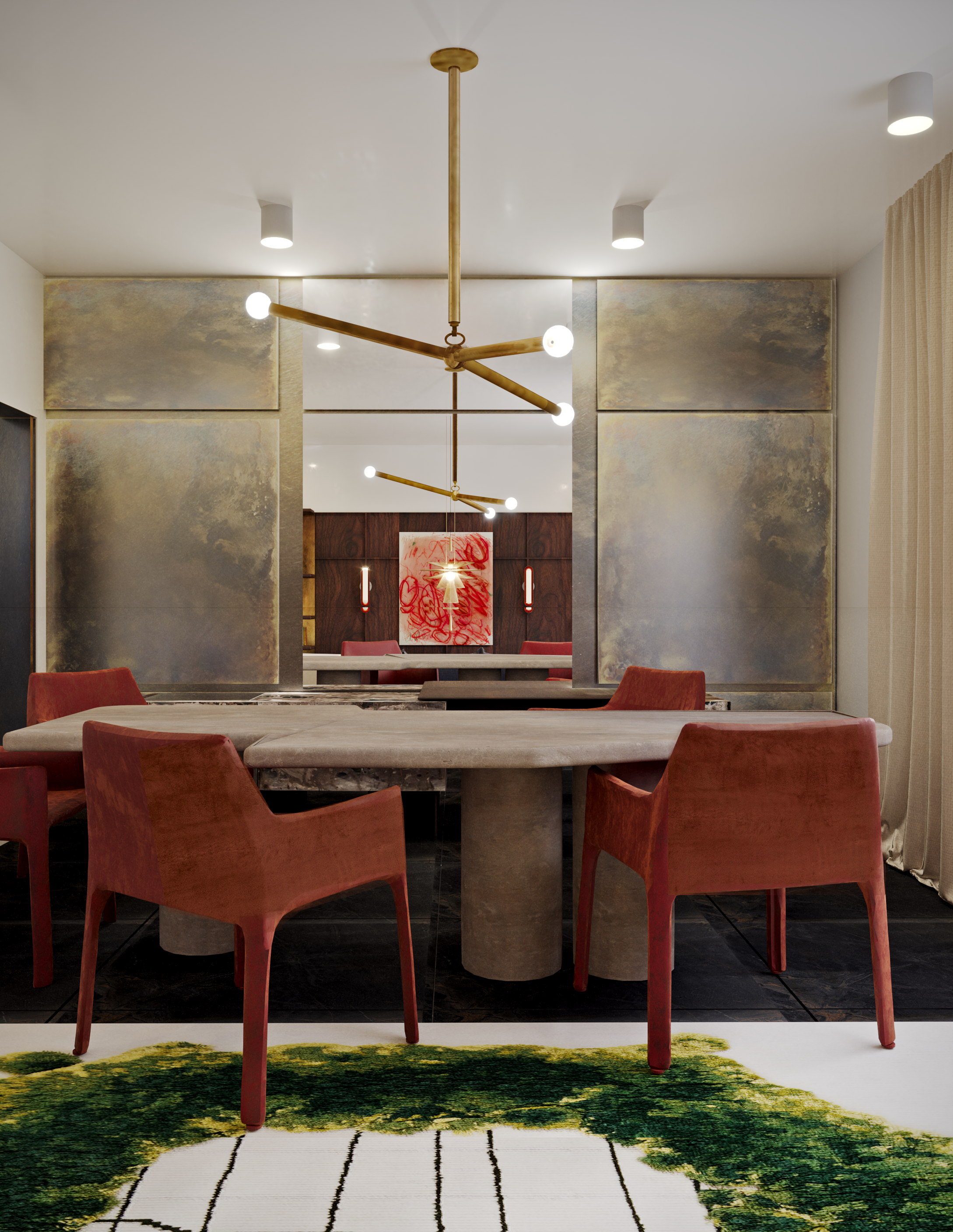 The materials chosen for this project come together in a dynamic and harmonious interaction. Concrete, brass, walnut, linen, ceramics, and lush velvet upholstery embody the essence of the project: a bold and brutalist spirit elegantly framed within our signature elegant and essentialistic canvas.